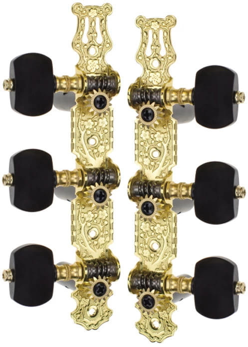 Колки установлены на цельную стальную планку в форме лиры с элегантным позолоченным покрытием. Закругленные ручки из прочного черного пластика обеспечивают удобный хват. Механизм гарантирует быструю и точную настройку, отлично держит строй и отличается долговечностью, дополняя внешний вид вашего инструмента стильным акцентом.