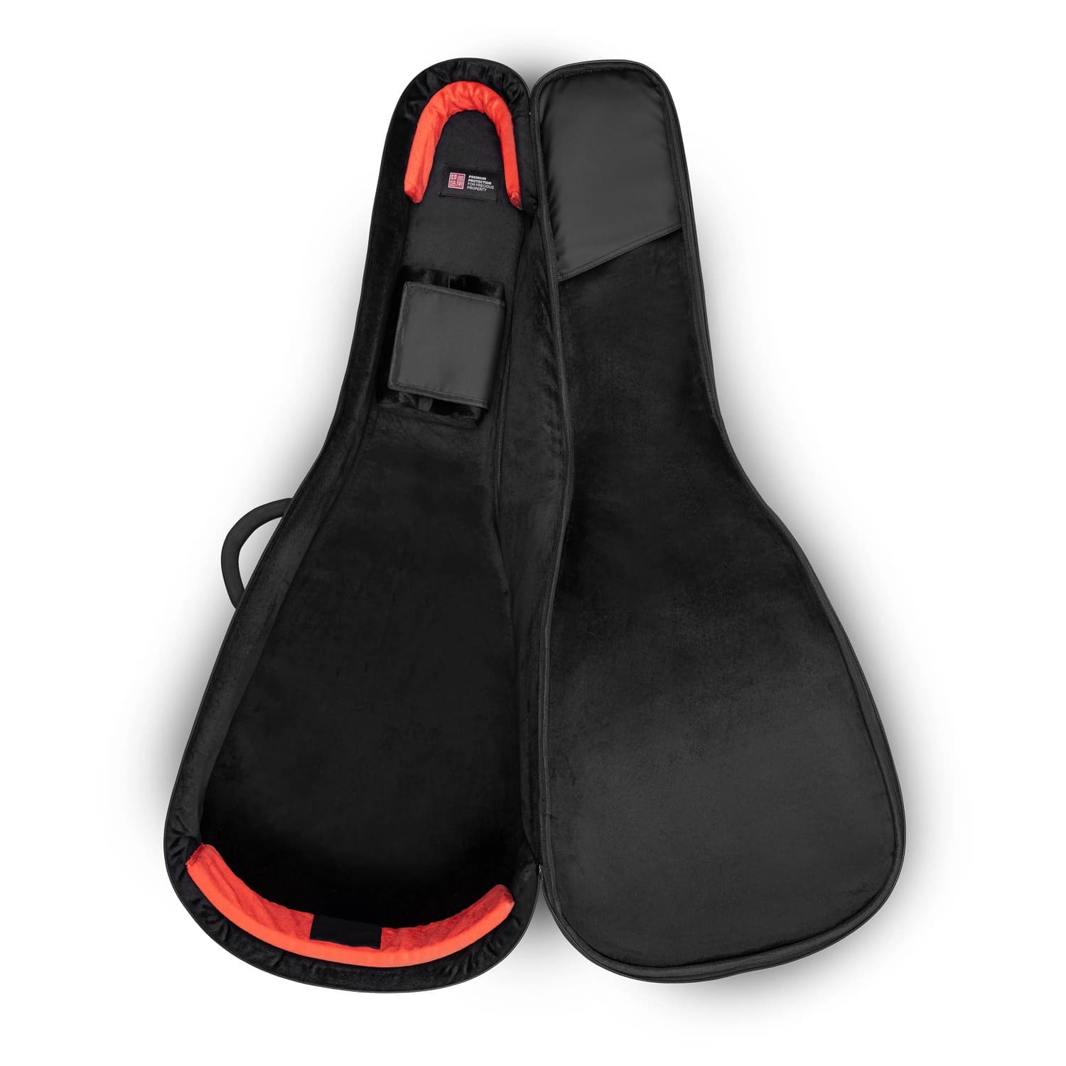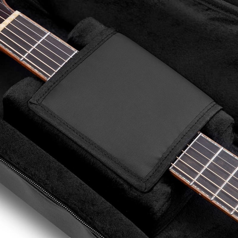 Внешний слой выполнен из износостойкого полиэстера с водоотталкивающей пропиткой, который надежно защищает гитару от дождя, снега и случайных брызг. Главная особенность модели — усиленная конструкция защиты: общая толщина демпфирующего слоя составляет внушительные 25 мм, а задняя стенка дополнительно укреплена жесткой пластиной из полипропилена. Это придает чехлу исключительную устойчивость к ударам и предотвращает прогибание корпуса при падениях или давлении. Внутри гитару обволакивает мягкий, экологичный велюровый ворс, который не имеет резкого запаха и абсолютно безопасен для лакированного покрытия инструмента — никаких химических реакций и царапин. Отдельного внимания заслуживает встроенная формованная поддержка грифа: она надежно фиксирует гитару в одном положении и гасит опасные нагрузки при рывках или случайных падениях. Дополнительную защиту корпуса обеспечивают 15-мм накладки из EVA-пены в наиболее уязвимых зонах.