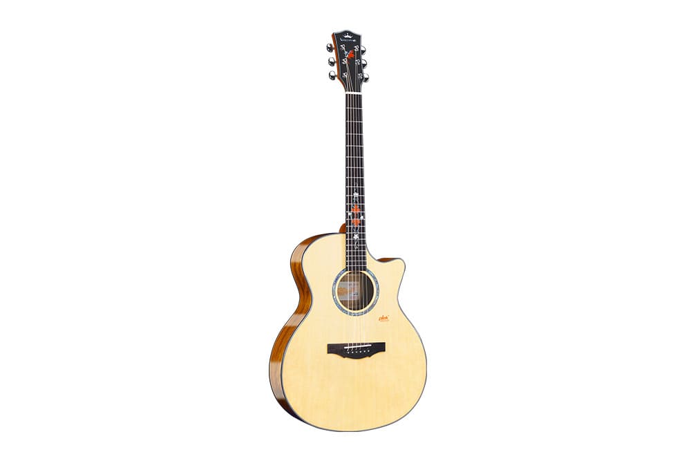 Верхняя дека выполнена из массива высококачественной ситхинской ели (AA Solid Sitka Spruce) с HTT‑обработкой, которая повышает прочность и устойчивость древесины к нагрузкам при активной игре. Обечайки и нижняя дека изготовлены из ламинированного овенгкола, обладающего красивым рисунком и широким звуковым диапазоном, близким к палисандру. Гриф выполнен из африканского махагони, а накладка и бридж из палисандра.