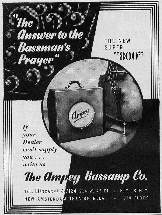 В 1946 году Эверетт Халл (Everette Hull), известный пианист и контрабасист, совместно со Стэнли Майклсом (Stanley Michaels) организовали в США предприятие «Michaels-Hull Electronic Labs», целью которого стало производство микрофонных звукоснимателей для контрабасов. Звукосниматели устанавливались внутрь корпуса контрабаса, и получили название Amplified Peg, для краткости «Ampeg».