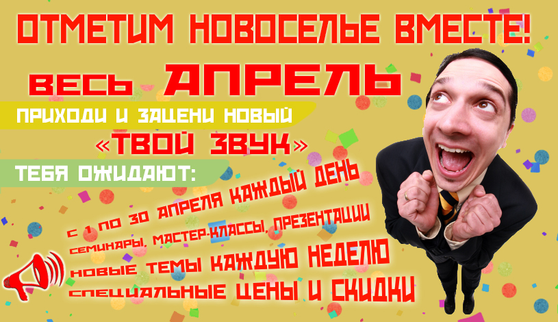 Спешим сообщить Вам, что у нас намечается праздник: начиная с 1-ого апреля и на протяжении всего месяца, мы будем рады представить Вам обновлённый «Твой Звук». Мы уже в предвкушении приятных встреч и новых знакомств, и надеемся, что даже несколько минут, проведённых среди коллег по цеху, окажутся не только приятными, но и полезными для всех! И вот что мы предлагаем ....