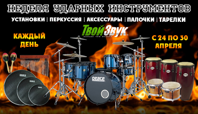 Отличная новость для барабанщиков и всех, у кого есть знакомые или друзья барабанщики! Всю неделю, с 24 по 30 апреля, у Вас будет отличная возможность познакомиться с нашим «ударным» ассортиментом, пообщаться с нашими специалистами на интересующие Вас темы и, конечно же, купить всё, что нужно настоящему барабанщику. А для того, чтобы наша встреча стала запоминающейся, мы подготовили ряд специальных предложений. А именно ...