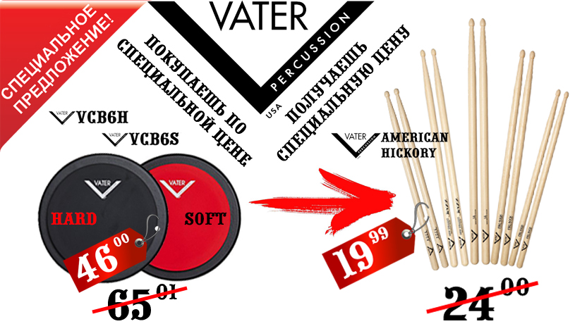 Покупая тренировочный пэд Vater 6′ по специальной цене, Вы получаете специальную цену и на барабанные палочки Vater серии American Hickory. Пэды представлены в двух моделях: