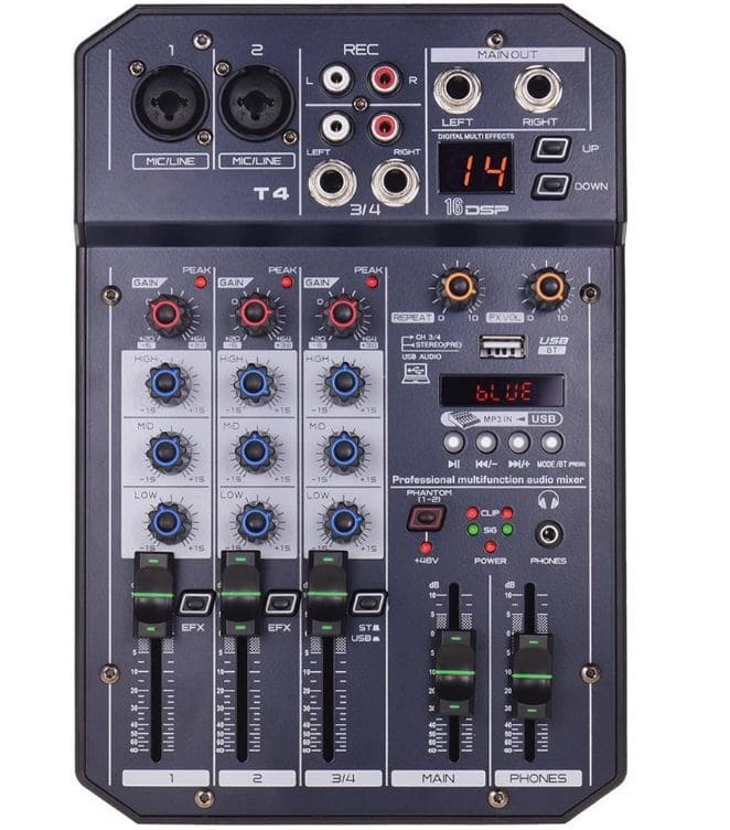 Важной особенностью T4 является встроенный DSP процессор на 16 пресетов эффектов, которые можно применить на первых двух каналах. Это позволит значительно обогатить ваш звук и избавляет от необходимости дополнительно подключать внешнее оборудование. Для настройки процессора есть 2-символьный дисплей, кнопки переключения пресета, ручка уровня эффектов и ручка их настройки.