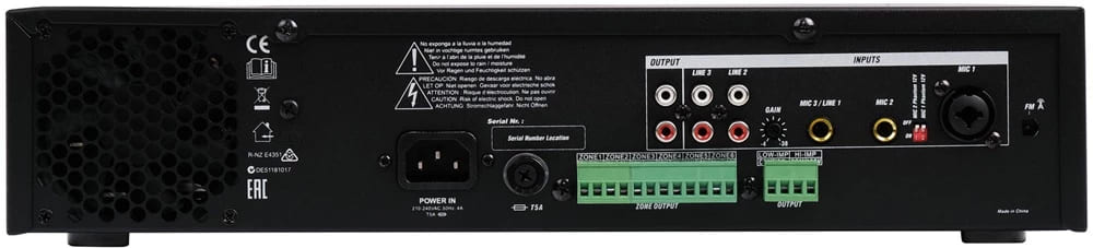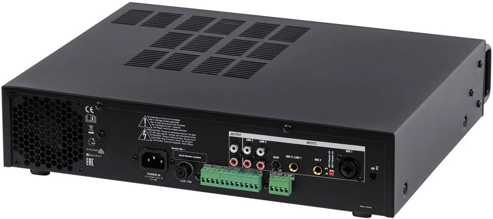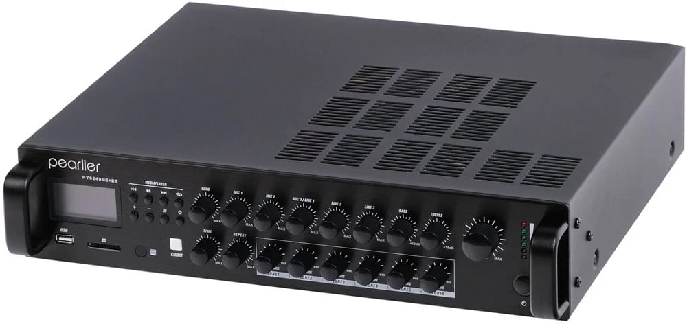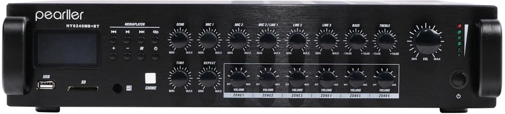 На борту — встроенный медиаплеер с поддержкой Bluetooth, USB, SD и FM-радио, что делает усилитель универсальным решением для презентационных, коммерческих и образовательных задач. При активации кнопки предварительного сигнала устройство воспроизводит выбранный тон перед голосовым объявлением, обеспечивая чёткую подачу информации.